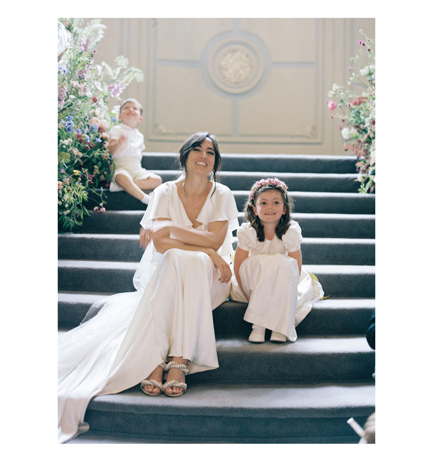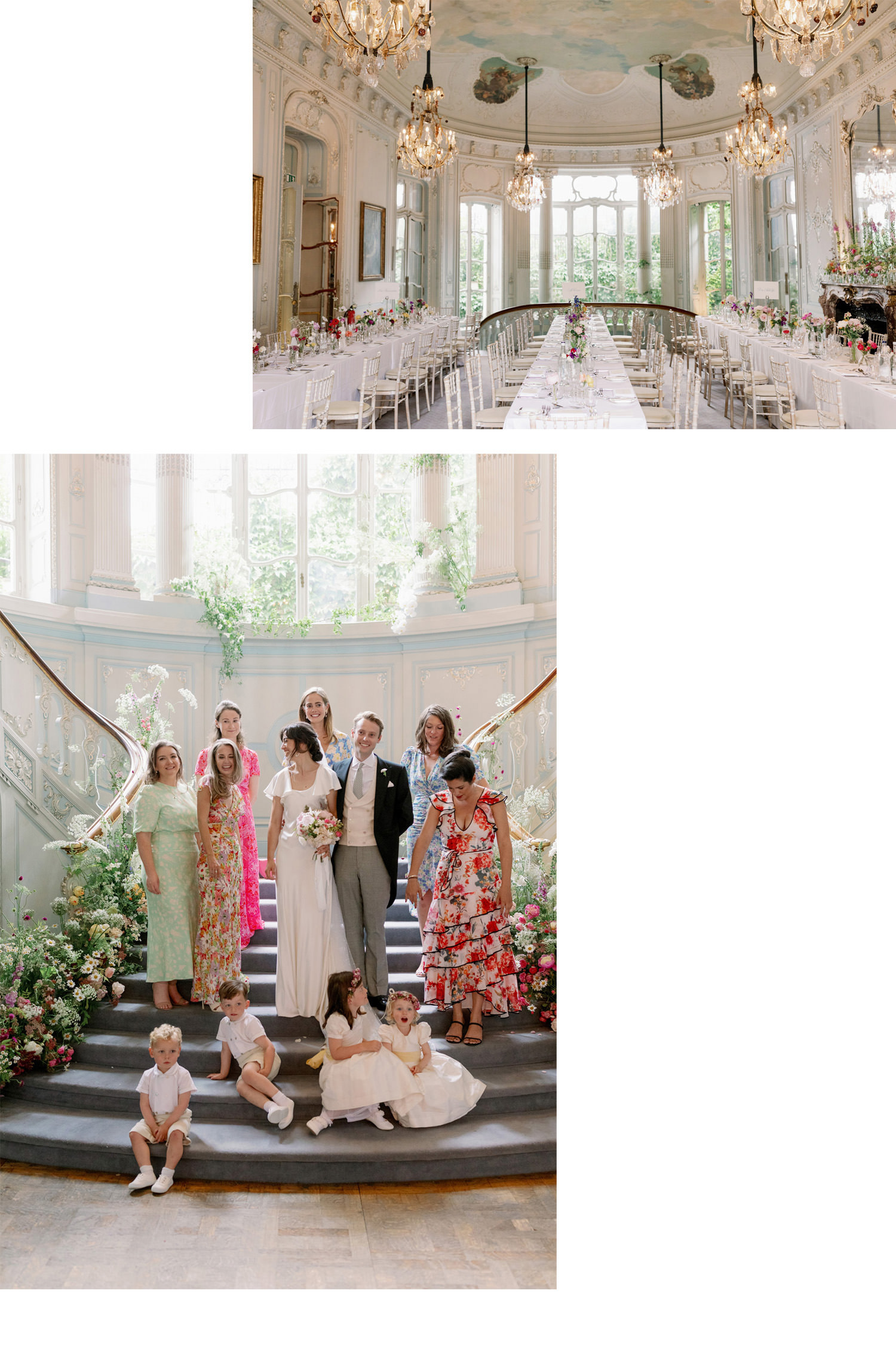 The staircase below is so stunning, which is why I’ve pictured here several times. There are of course a plethora of moments with the guests. When I’m confronted by such an array of colour, light and floral design I’m naturally inclined to show those images. In the portraits lower down there are a mix of film and digital images. Sometimes the organic nature of a film shot contains is own beauty that can’t be created in any other way. On the day I also use a small point and shoot camera for unguarded moments on the dance floor, again it has it’s own unique beauty and colour. Not always perfect but that’s the point. The images are always about feeling over anything else.